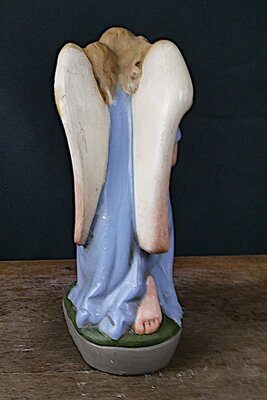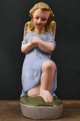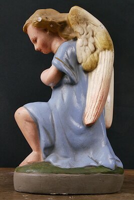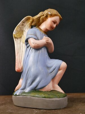 Kleiner Engel mit blauen, kurzem Kleid und golden- weißen Flügeln. Der Engel sitzt auf einer runden grünen Wiese, die wiederum auf einem grauen runden Sockel ruht. Der Engel hat in Anbetehaltung die beiden Hände vor der Brust. Wahrscheinlich ursprünglich Bestandteil einer Weihnachtskrippe oder eines Altars. Zum Zeitpunkt der Inventarisierung (Juni 2024) wurden mehrere unterschiedlich bemalte Engel dieses Typ auf den Gebrauchtwaren-Servern angeboten.