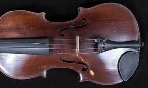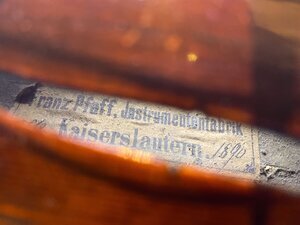 Geige, Fabrikat Franz Pfaff, Kaiserslautern gebaut 1890 Im Geigenkasten mit zwei Bögen, Ersatzwirbel und Kolophonium