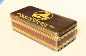 Eine Original Adler Werkzeugbox . Die Box ist aus Blech gefertigt und braun lackiert. Der aufklappbare Deckel ist mit dem Firmenlogo und der Firmenbeschriftung "Kochs Adler Nähmaschinen Werke AG, Bielefeld" verziert. Die Box beinhaltet noch Zubehörteile der Adler Overlockmaschine Typ 81-6 (Siehe Link)