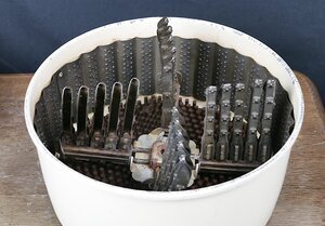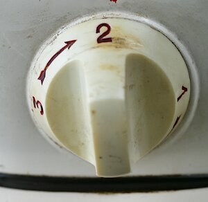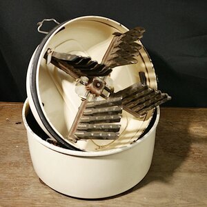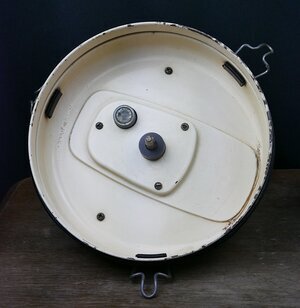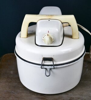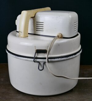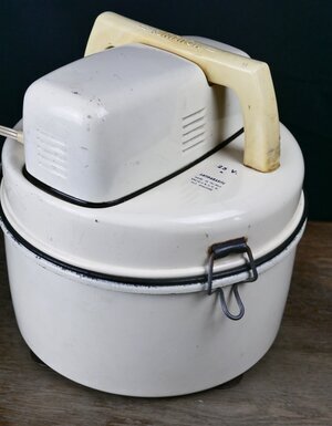 Kartoffelschälmaschine der späten 1950er Jahre. Die Maschine wurde im Februar 1959 als neue perfekte Kartoffel Schälmaschine auf der Berliner Landwirtschaftsausstellung vorgestellt. Die Maschine wurde - wohl in Bordeaux - in Frankreich erworben und war auf Grund der technischen Ausstattung für den französischen Markt bestimmt. Die Maschine arbeitet nach dem so genannten Korundverfahren. Im Topf der Maschine befindet sich ein beweglicher vierflüglicher Einsatz mit vielen scharfen Zähnen. Letztere finden sich auch innen an der Außenwand. Die (nicht zu großen) Kartoffeln werden in den Topf gelegt. Der Einsatz wird unten am Deckel angebracht, Der Deckel wird geschlossen und der Einsatz wird mittels des am Deckel angebrachten Motor bewegt. Dadurch bewegen sich auch die Kartoffeln und deren Schale wird mittels der scharfen Zähne an den Flügeln und der Außenwand abgeraspelt. Ein Drehschalter oben am Motor ist mit einer Zeitschaltuhr verbunden. Mit ihm konnte man die Laufzeit des Schälvorgangs einstellen. Interessant ist der Stromanschluss: Das Anschlusskabel ist dreiadrig und endet in einem Typ-E-Stecker. Der Stecker besitzt zwei runde Kontaktstifte für den spannungsführenden Leiter (Außenleiter) und für den Neutralleiter. Versetzt in der Mitte befindet sich eine Kontaktöffnung, die den Kontaktstift der Steckdose für den Schutzleiter aufnimmt. Dieser Steckertyp ist/war in Frankreich, Belgien und einigen weiteren Ländern gebräuchlich. Dieser Stecker ist prinzipiell auch den in vielen Europäischen Ländern gebräuchlichen Schuko-Steckdosen verwendbar, bietet hier aber keine Kontaktmöglichkeit für den Schutzleiter. Da das Gerät vornehmlich aus Metallteilen besteht dürfte es z.B. in Deutschland ohne Zwischenstecker mit 5 A Leistung nicht betrieben werden. Aufschrift auf der Unterseite des Steckers: COPER 5A-220V H M Statt einer Plakette mit den technischen Daten besitzt das Gerät den folgenden Aufdruck (z.T. nur noch sehr schlecht lesbar) 125 V. (die 1 kaum mehr lesbar) ( Etwas nicht mehr lesbares) ANTIPARASITE MADE IN FR/NOE (das O ist kaum mehr lesbar) BREVETÉ S.G.D.G. PAT. PENDGING Die letzten beiden Zeilen weisen darauf hin, dass das Gerät durch ein Patent beim französischen Patentamt geschützt war. Ein zu dieser Maschine passendes Patent ist in der Datenbank des DPMA nicht auffindbar. Das Patent https://depatisnet.dpma.de/DepatisNet/depatisnet?action=pdf&docid=DE000001956678U&xxxfull=1 einer Gemüseputzmaschine von Moulinex hat wie 3 andere vergleichbare Patente den Motor unten und nicht im Deckel. Eine andere Besonderheit ist die Angabe 125 Volt, was mit der heute üblichen Netzspannung von 220 bis 230 Volt Probleme geben könnte. Die Maschine wurde von den letzten Besitzern viele Jahre mit der Netzspannung von 220V betrieben und diese wunderten sich, dass die Maschine so schnell heiß wurde. Der "Französische Stecker" wurde dabei in eine moderne Schuko-Steckdose gesteckt, wodurch kein Kontakt für den Schutzleiter bestand. Glücklicherweise kam nie Strom auf das Metallgehäuse ...