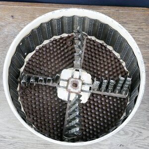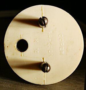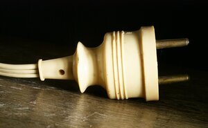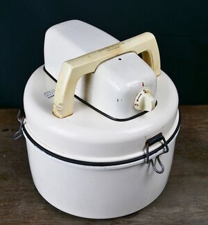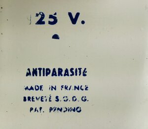 Kartoffelschälmaschine der späten 1950er Jahre. Die Maschine wurde im Februar 1959 als neue perfekte Kartoffel Schälmaschine auf der Berliner Landwirtschaftsausstellung vorgestellt. Die Maschine wurde - wohl in Bordeaux - in Frankreich erworben und war auf Grund der technischen Ausstattung für den französischen Markt bestimmt. Die Maschine arbeitet nach dem so genannten Korundverfahren. Im Topf der Maschine befindet sich ein beweglicher vierflüglicher Einsatz mit vielen scharfen Zähnen. Letztere finden sich auch innen an der Außenwand. Die (nicht zu großen) Kartoffeln werden in den Topf gelegt. Der Einsatz wird unten am Deckel angebracht, Der Deckel wird geschlossen und der Einsatz wird mittels des am Deckel angebrachten Motor bewegt. Dadurch bewegen sich auch die Kartoffeln und deren Schale wird mittels der scharfen Zähne an den Flügeln und der Außenwand abgeraspelt. Ein Drehschalter oben am Motor ist mit einer Zeitschaltuhr verbunden. Mit ihm konnte man die Laufzeit des Schälvorgangs einstellen. Interessant ist der Stromanschluss: Das Anschlusskabel ist dreiadrig und endet in einem Typ-E-Stecker. Der Stecker besitzt zwei runde Kontaktstifte für den spannungsführenden Leiter (Außenleiter) und für den Neutralleiter. Versetzt in der Mitte befindet sich eine Kontaktöffnung, die den Kontaktstift der Steckdose für den Schutzleiter aufnimmt. Dieser Steckertyp ist/war in Frankreich, Belgien und einigen weiteren Ländern gebräuchlich. Dieser Stecker ist prinzipiell auch den in vielen Europäischen Ländern gebräuchlichen Schuko-Steckdosen verwendbar, bietet hier aber keine Kontaktmöglichkeit für den Schutzleiter. Da das Gerät vornehmlich aus Metallteilen besteht dürfte es z.B. in Deutschland ohne Zwischenstecker mit 5 A Leistung nicht betrieben werden. Aufschrift auf der Unterseite des Steckers: COPER 5A-220V H M Statt einer Plakette mit den technischen Daten besitzt das Gerät den folgenden Aufdruck (z.T. nur noch sehr schlecht lesbar) 125 V. (die 1 kaum mehr lesbar) ( Etwas nicht mehr lesbares) ANTIPARASITE MADE IN FR/NOE (das O ist kaum mehr lesbar) BREVETÉ S.G.D.G. PAT. PENDGING Die letzten beiden Zeilen weisen darauf hin, dass das Gerät durch ein Patent beim französischen Patentamt geschützt war. Ein zu dieser Maschine passendes Patent ist in der Datenbank des DPMA nicht auffindbar. Das Patent https://depatisnet.dpma.de/DepatisNet/depatisnet?action=pdf&docid=DE000001956678U&xxxfull=1 einer Gemüseputzmaschine von Moulinex hat wie 3 andere vergleichbare Patente den Motor unten und nicht im Deckel. Eine andere Besonderheit ist die Angabe 125 Volt, was mit der heute üblichen Netzspannung von 220 bis 230 Volt Probleme geben könnte. Die Maschine wurde von den letzten Besitzern viele Jahre mit der Netzspannung von 220V betrieben und diese wunderten sich, dass die Maschine so schnell heiß wurde. Der "Französische Stecker" wurde dabei in eine moderne Schuko-Steckdose gesteckt, wodurch kein Kontakt für den Schutzleiter bestand. Glücklicherweise kam nie Strom auf das Metallgehäuse ...