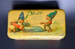 Um 1900 wurde neuen Maschinen noch eine kunstvoll bedruckte Werkzeugbox beigepackt. Später wurde die Gestaltung immer einfacher. Die Boxen wurden erst einfarbig, noch mit Firmenaufdruck, danach nur noch Neutral, bis sie ganz wegfielen. Bei unserem Objekt sind auf dem buntbedruckten Deckel zwei Zwerge abgebildet, die sich mit einem Lang- oder Schwingschiffchen beschäftigen. Im oberen Teil des Deckels steht der Name Pfaff - Nähmaschinen. Die Bezeichnung „Nähmaschine“ wird in 5 verschiedenen Sprachen wiederholt. Der Inhalt besteht aus div Zubehörteilen, die wir keiner speziellen Maschine zuordnen können.