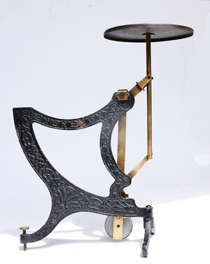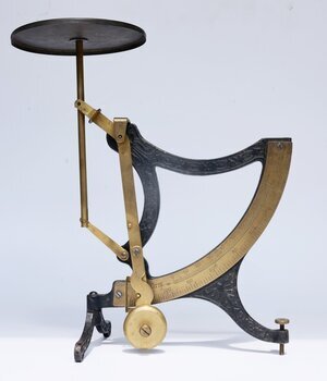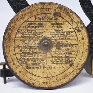 Große zwischen zwei Skalen umstellbare Einpendel-Briefwaage. Der Körper der Waage ist schwarz lackiert und zeigt abstraktes Jugendstil-Dekor. Die Waage besitzt 2 Skalen: Die innere Skala reicht von 0 bis 100 g mit Strichen für jedes Gramm, die äußere Skala reicht von 0 g bis 500 g mit Strichen in 5 g Schritten. Je nachdem. ob das Gegengewicht nach oben oder unten geklappt wurde, ist die eine oder die andere Skala relevant. Die Waage besitzt 3 Füße und und ein Rändelrad. Mit diesem kann sie in die Waagerechte und die Anzeige ohne aufliegendem Gewicht auf den Nullpunkt der jeweiligen Skala gebracht werden. Die Unterlage für das Wiegegut zeigt die Portosätze für "Ortsverkehr", "Deutschland u.d.Schutzgebeite" sowie für "Weltpostverein". Die Waage ist nicht geeicht und konnte nur für den privaten Gebrauch verwendet werden.