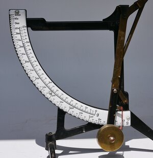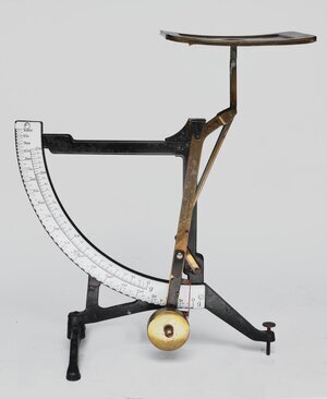 Große zwischen zwei Skalen umstellbare Einpendel-Briefwaage. Der Körper der Waage ist schwarz lackiert. Die Waage besitzt 2 Skalen: Die innere Skala reicht von 0 bis 250 g mit Strichen für jedes Gramm, die äußere Skala reicht von 0 g bis 1000 g mit Strichen in 5 g Schritten. Je nachdem ob das Gegengewicht nach oben oder unten geklappt ist, ist die eine oder die andere Skala relevant. Die Waage besitzt 3 Füße und ein Rändelrad. Mit diesem kann sie in die Waagerechte und die Anzeige ohne aufliegendem Gewicht auf den Nullpunkt der jeweiligen Skala gebracht werden. Die Waage ist nicht geeicht und konnte nur für den privaten Gebrauch verwendet werden. Der Hersteller ist Jakob Maul. Das von 1912 bis 1983 (neben anderen Logos) verwendete Firmenlogo ist auf der Rückseite in einer Strebe zur Verbindung der Füße eingeprägt. Das Unternehmen aus Bad König-Zell ist auch heute (2024) noch aktiv und produziert innovative Büroprodukte.
