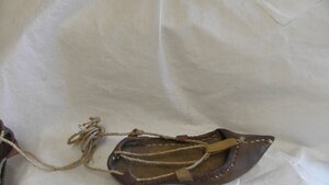 Ein Paar Goldbraune Damen-Slipper aus Stoff. Die Schuhe haben eine Spitze Form und keinen Absatz. Vorne um die Schuhöffnung befindet sich ein langer Stoffstreifen. Zudem befinden sich auf dem Schuh Stickereien. Es handelt sich hierbei um handbestickte Frauenschuhe aus einem Fürstenhaus in Nordeuropa. Datiert auf 1700.