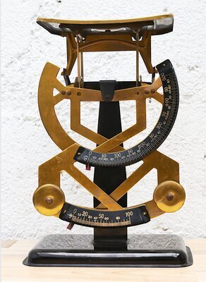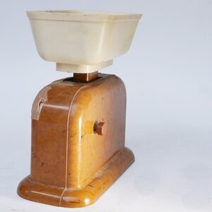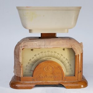 Oberschalige Haushalts-Federwaage aus dem Haus Dr. Oetker. Federwaagen bestimmen ein Gewicht aufgrund der Verformung einer im Inneren der Waage befindliche Feder. Da es sich bei Dr. Oetker um einen Lebensmittelproduzenten und keinen Waagenbauer handelt, ist stark zu vermuten, dass die Waage von einer Drittfirma im Auftrag produziert wurde Die Waage besteht aus einem Hexaeder mit einer Außenhaut aus hellbraunem Bakelit. Diese ist stark beschädigt und mit einem Klebeband notdürftig repariert. Die Ecken oben sind abgerundet. Auf einem Teil der Vorderseite ist hinter einer durchsichtigen Fenster mit Kunststoffverkleidung die Skala mit Zeiger zu sehen. Die Skala reicht von 0 g bis 1000 g. Die kleinste Unterteilung sind Striche für 5 g Abstände. Noch im Fenster befindet sich der Schriftzug D.R.G.M. für Deutsches Reich Gebrauchs Muster. Leider sind diese aus der Zeit vor dem Zweiten Weltkrieg verloren gegangen. Unterhalb dieses Fensters wieder auf Bakelit ist das Firmenlogo einschließlich des Schriftzugs Dr. Oetker. An der Rückseite der Waage befindet sich eine Justierschraube. Unter der eigentlichen Waage ist das Bakelit zu einem Fuß erweitert. An der Vorderseite ist dieser beschädigt. Fest verbunden mit der Waage ist über dieser ein weißes Schüsselchen zur Aufnahme des Wiegeguts.
