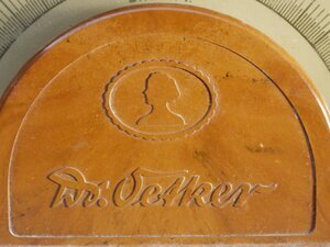 Oberschalige Haushalts-Federwaage aus dem Haus Dr. Oetker. Federwaagen bestimmen ein Gewicht aufgrund der Verformung einer im Inneren der Waage befindliche Feder. Da es sich bei Dr. Oetker um einen Lebensmittelproduzenten und keinen Waagenbauer handelt, ist stark zu vermuten, dass die Waage von einer Drittfirma im Auftrag produziert wurde Die Waage besteht aus einem Hexaeder mit einer Außenhaut aus hellbraunem Bakelit. Diese ist stark beschädigt und mit einem Klebeband notdürftig repariert. Die Ecken oben sind abgerundet. Auf einem Teil der Vorderseite ist hinter einer durchsichtigen Fenster mit Kunststoffverkleidung die Skala mit Zeiger zu sehen. Die Skala reicht von 0 g bis 1000 g. Die kleinste Unterteilung sind Striche für 5 g Abstände. Noch im Fenster befindet sich der Schriftzug D.R.G.M. für Deutsches Reich Gebrauchs Muster. Leider sind diese aus der Zeit vor dem Zweiten Weltkrieg verloren gegangen. Unterhalb dieses Fensters wieder auf Bakelit ist das Firmenlogo einschließlich des Schriftzugs Dr. Oetker. An der Rückseite der Waage befindet sich eine Justierschraube. Unter der eigentlichen Waage ist das Bakelit zu einem Fuß erweitert. An der Vorderseite ist dieser beschädigt. Fest verbunden mit der Waage ist über dieser ein weißes Schüsselchen zur Aufnahme des Wiegeguts.