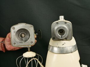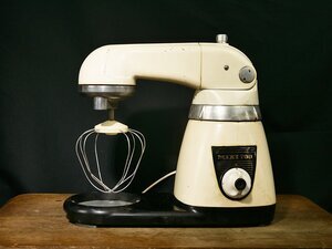 MIXI Küchenmaschine zum Rühren und Kneten von Teig. Die vorwiegend weiße Maschine besteht aus einem Sockel mit einem über einen Drehschalter anschaltbaren Motor. Auf dem Sockel ist ein Arm befestigt auf dem wiederum ein Quirl oder ein Knethaken angebracht werden kann. Die Maschine ist voll funktionsfähig. Der Mixeraufsatz ist abgängig.