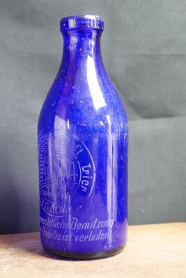 Blaue 4 l fassende Milchflasche der Milchgenossenschaft Trier g.G.m.b.H. Die Trierer Milchgenossenschaft existierte in der 2. Hälfte des 20. Jahrhunderts und hatte ihre Anlagen an der Bahn in Trier-Nord. Die Flasche in klassische Milchflaschenform mit engem Halt zweigt in der Mitte eine Zeichnung mit weißen Strichen, die ein stattliches Gebäude darstellt. Darunter steht Kaiserpalast. Eingerahmt ist sie mit dem beidseitig umramdeten Schriftzug MILCHGENOSSNSCHAFT TRIER g.G.m.b.H. Links davon steht "Eingetr. Warenzeichen" und unten "Die widerrechtliche Benutzung dieser Flasche ist verboten".