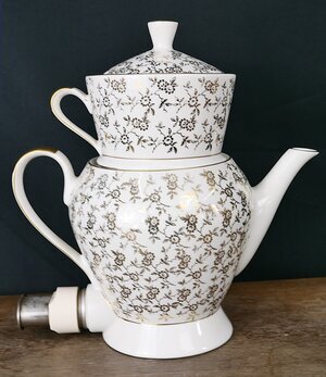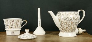 Der Perkolator (auch Percolator; vom lateinischen 'percolare', übersetzt: 'filtern'), umgangssprachlich auch Dröppelminna genannt, der Marke Fulgura (lat. für Blitz) wurde von der Fränkische Porzellanfabrik Neuerer in Oberkotzau (nahe Hof) entwickelt und hergestellt. Es handelt sich um das MODELL 100: 1,2L (8 TASSEN ) AROMATOR -N.607- genannt "Der Dicke". Er wurde von den 1950er-jahren bis Anfang der 1960er Jahre in mehreren Designvarianten hergestellt. Unser Perkolator stammt aus dem Jahr 1960. Das Gerät steht einem ringförmigen Porzellansockel. Der untersten Teil in Form einer Kaffeekanne ist am Anfang der Wasserbehälter. In ihm befindet sich außen ein Bügeleisenstecker und innen ein Heizrohr. In ihm ist am Ende der Kaffee, der mit einem Ausgussschnabel in die Tassen gegossen werden kann. In diesem befindet sich ein Steigrohr mit einer unten liegenden Auffangkalotte. Das Steigrohr führt nach oben in den oberen, abnehmbaren Teil des Geräts, dem Behälter für den gemahlenen Kaffee. Am oberen Teil ist an einem - in zusammengebautem Zustand nicht sichtbaren - Ring das Firmenlogo angebracht. Oben Schräg der Schriftzug "Aromator" für den Namen des Produkts, darunter der Schriftzug BAVARIA und unter diesem in einer wappenähnlichen Umrandung die "Initialen" N und O für "Neuerer Oberkotzau". Wird das schalterlose Gerät an die Stromversorgung angeschlossen so wird das Wasser in der Heizmulde erhitzt. Durch eine am unteren Ende des Steigrohrs angebrachte Auffangkalotte werden Dampfblasen aufgefangen. Wie bei einer Mammutpumpte steigen die Wasserdampfblasen zusammen mit Wassertröpfchen nach oben. Das Ansaugrohr durchstößt den Behälter mit dem Kaffeepulver und endet erst kurz unter dem Deckel. Der Wasserdampf mit seinen Wassertröpfchen spritzt dort gegen den Deckel und kondensiert dort. Die Tröpfchen landen auf dem Kaffeepulver auf dem Porzellanflilter und werden damit über das nicht zu fein gemahlene Kaffeemehl verteilt. Vom Kaffeebehälter tropft es von oben wieder nach unten in die Kaffeekanne. Im Laufe der Zeit wird das ganze Wasser aus dem Behälter einmal hochgedrückt und durchläuft den Behälter mit dem Kaffeepulver. Der fertige Kaffee kann ausgegossen und in Kaffeetassen gefüllt werden. Je länger dieser Brühvorgang dauert, desto stärker wird der Kaffee.