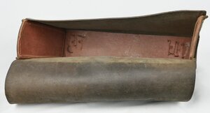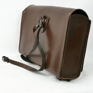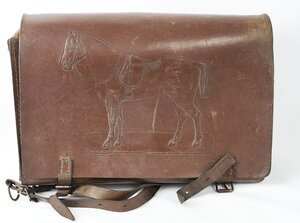 Die Schultasche, oder auch der Schulranzen ist aus dunkelbraunem Leder gefertigt und sie besitzt auf Vorderseite ein eingeprägtes Pferdemotiv Der Deckel der Tasche wird mit zwei Schnallen am unteren Rand der Vorderseite geschlossen und die Träger sind auf der Rückseite mittig befestigt. Am Boden der Tasche sind sie auf der einen Seite mit einer Schnalle befestigt und auf der anderen Seite kann der Träger einfach ein- und wieder ausgehängt werden. So ließ sich die Tasche leichter an- und wieder ausziehen. Der Innenraum der Tasche besteht aus einem einzigen großen Fach. Die Seiten und der Boden der Tasche sind mit Karton verstärkt, damit die Tasche nicht so leicht ihre Form verliert. Es finden sich keinerlei Prägungen oder Aufkleber, die einen Hinweis auf den Hersteller geben.
