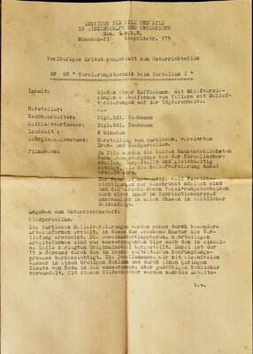 Lehrfilm zur Verzierungstechnik beim Porzellan Teil 1 des Instituts für Film und Bild in Wissenschaft und Unterricht. Warnzettel den Film nicht falsch einzulegen. Film vorhanden. Aus dem Bestand der Kreisbildstelle Trier-Land. Weiterhin vorhanden ist ein ursprünglich schreibmaschinengeschriebenes zweiseitiges Beiblatt zum Inhalt des Films.