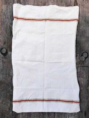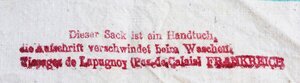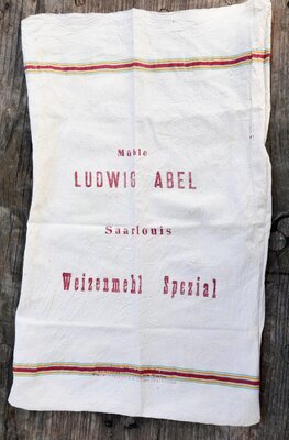 Drei Mehlsäcke aus Saarlouis und wahrscheinlich aus der Zeit, als das Saargebiet zu Frankreich gehörte. Die Mehlsäcke sind aus Nesselstoff. Im unteren und oberen Teil besitzen sie einen eingewebten mehrfarbigen Streifen. Dazwischen steht der Aufdruck: Mühle LUDWIG ABEL Saarlouis Weizenmehl Spezial Auf oder unter dem unteren Zierband die Aufschrift: Dieser Sack ist ein Handtuch die Aufschrift verschwindet beim Waschen Tiesages de Lapugnoy Pas de Calais FRANKREICH