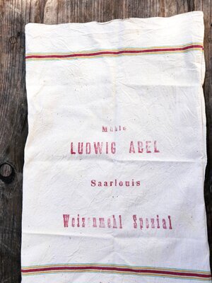 Drei Mehlsäcke aus Saarlouis und wahrscheinlich aus der Zeit, als das Saargebiet zu Frankreich gehörte. Die Mehlsäcke sind aus Nesselstoff. Im unteren und oberen Teil besitzen sie einen eingewebten mehrfarbigen Streifen. Dazwischen steht der Aufdruck: Mühle LUDWIG ABEL Saarlouis Weizenmehl Spezial Auf oder unter dem unteren Zierband die Aufschrift: Dieser Sack ist ein Handtuch die Aufschrift verschwindet beim Waschen Tiesages de Lapugnoy Pas de Calais FRANKREICH