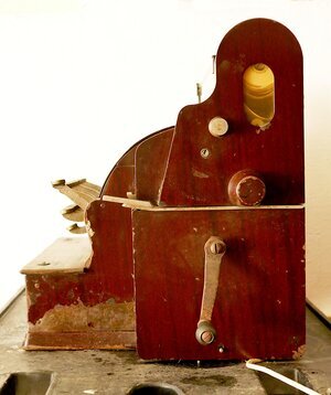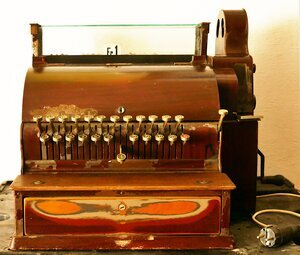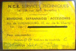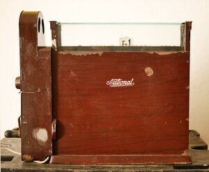 Historische Registrierkasse der Marke "National". Hersteller der Kasse ist die National Cash Register (NCR) mit damaligem Sitz in Dayton (USA). Hergestellt wurde die Kasse höchstwahrscheinlich für den Europäischen Markt im 1902 oder 1903 errichteten Werk in Berlin-Neukölln, der damals zweitgrößten Registrierkassenfabrik der Welt. Unsere Kasse ist eine so genannte Hebel-, Blitz- oder Fähnchenkasse der Klasse 200 (?) mit Kurbel und Elektroanschluss. Sie wurde später (mehrmals?) umgebaut. Von einer Papierrolle, die rechts oben eingelegt wurde wird für den Kunden ein Beleg gedruckt und aus dem Schlitz ausgegeben. Alternativ kann ein Beleg von der eingelegten Papierrolle ausgedruckt werden. Die Kasse ist innen aus Metall. Die Hülle ist aus Blech und mit einer dunkles Holz imitierender Farbe gestrichen. Die Schublade und das Brett über das Präfix "Fr." Dies deutet darauf hin, dass diese Kasse für ein (europäisches) mit der Währung Franc/Franken produziert wurde. Da im Inneren der Kasse ein Zettel der Luxemburger Außenstelle der Brüsseler Niederlasung von N.C.R. SERVICES TECHNIQUES (siehe Foto) klebt, kann davon ausgegangen werden, dass die Kasse in Luxemburg zum Einsatz kam und die Abkürzung "Fr" sich hier auf Luxemburger Francs bezieht. Die Kasse ist nicht funktionsfähig. Der Schlüssel zur Schublade ist abgängig. Probleme: Nach der Gerätenummer müsste die Kasse 1933 produziert worden sein. Dazu erscheint das Modell aber sehr altertümlich, und könnte eher in die Zeit um 1900 datiert werden. Die Modellnummer 1727-E konnte bisher keinem Modell zugeordnet werden. Fähnchenkassen hatten meist keine Kurbel (das Vorhandensein der Kurbel würde eher auf das Produktionsdatum 1933 hindeuten). Wofür wurde der Elektroanschluss genutzt. Darüber ob die Kasse in den USA oder in D hergestellt wurde gibt es unterschiedliche Informationen. Das Unternehmen: Im späten 19, Jahrhundert gründete John Henry Patterson den ersten Kassenhersteller National Cash Register in Dayton (Ohio). Sie wurde sogleich zum unangefochtenen Marktführer bei Registrierkassen von späten 19. Jahrhundert bis zum Niedergang (elektro-)mechanischer Kassen Ende der 1970er Jahre. 1896 wurde in Deutschland die Nationale Registrierkassen GmbH (NRK) gegründet. 1953 stieg das Unternehmen in die elektronische Datenverarbeitung ein. 1991 wurde NCR von AT&T übernommen. Ende 1996 trennte sich die AT&T wieder von NCR. 1997 zog sich die Firma aus dem PC-Geschäft zurück. Die NCR Corporation ist heute Weltmarktführer im Finanz-SB-Bereich, Scannerkassen, Data Warehousing , und einer der führenden Anbieter von Gastronomie-Kassenlösungen.