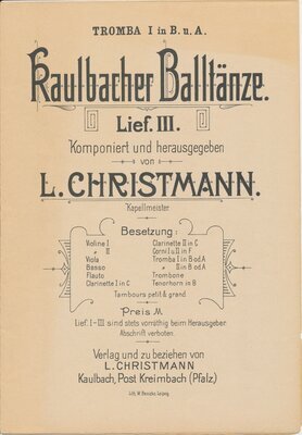 Kaulbacher Balltänze Lief III Komponiert und herausgegeben von L. Christmann - Tromba I in B u. A Ludwig Christmann (1857-1937), Kaulbach, Der Vater des Pfalzforschers Prof. Ernst Christmann, Liess 35 Tänze im Eigenverlag drucken