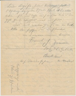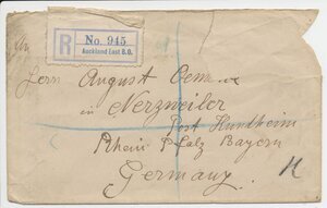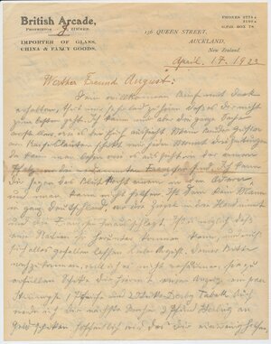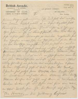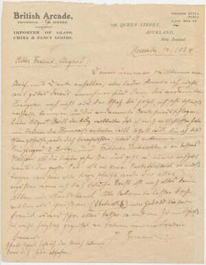 Patriotische Grüße des Geschäftstüchtigen Wandermusikanten Zimmer aus Neuseeland an den Freund August Oemke in Nerzweiler