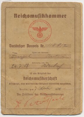 Reichsmusikkammer Ausweis des Anton Engel, ausgestellt in Berlin am 07.10.1936
