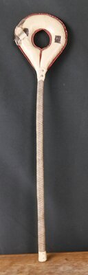 Kleidungsklopfer zum Klopfen und zur Reinigung von Fusseln z.B. für Anzüge. Das Gerät besteht aus eine Stiel mit 2 Holzstecken. Diese sind von Textil und an beiden Enden mit einem Klebeband umwickelt. Der Stiel mündet oben in den relativ weichen eigentliche Klopfer. Dieser ist rund aus Textil, mit Heu ausgestopft und besitz in der Mitte ein Loch. Die Rückseite ist leicht beschädigt.