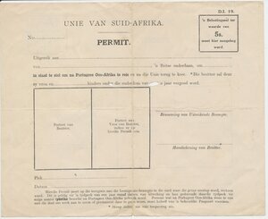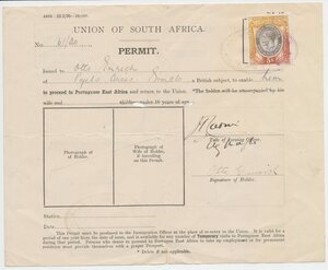 Ausreiseerlaubnis des Otto Emrich von der britischen "Union of South Africa" zur Weiterreise in die Portugiesische Kolonie "Portuguese East Africa" mit anschließender Rückkehr in die britische Kolonie.