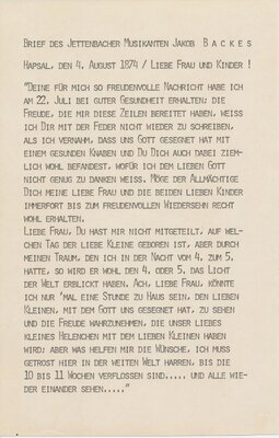 Brief des Jettenbacher Wandermusikanten Jakob Backes vom 04.08.1874 aus Hapsal an seine Frau und Kinder.