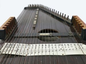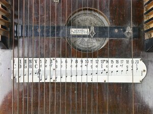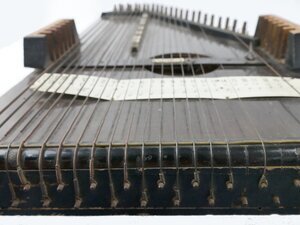 Fragment einer Autoharp (Manualzither) - einer speziellen Zither. Die Zither ist aus schwarz gefärbtem Holz gebaut, Wirbel und Saiten sind aus Stahl. Die Tafel mit den Tonhöhen der einzelnen Saiten ist aus Kunststoff, der Zettel unter dem Schallloch ist aus Papier. Durch drücken des jeweiligen Knopfs der Klaviatur quer über den Saiten werden alle Saiten gedämpft; die nicht zum gedrückten Akkord passen. Der Aufbau mit der Klaviatur ist abgängig. Die Zither besitzt eine einseitige Besaitung mit 36 Seiten für des Bereichs von c' bis (hb)''. Eine Autoharp ermöglicht es ähnlich wie bei einer "Schlagguitarre ohne weitere Kenntnisse Begleitakkorde zu spielen und damit z.B. zu einem Melodieinstrument oder einem Gesang die Begleitung zu schrubben. Aufschrift auf dem Einlagezettel: T. Meinholds AUTOHARP Made in Germany, Patent Vollkommenstes Instrument der Gegenwart. Mit dieser Zither kann man nur Akkorde spielen. Sie ist die Zither für Menschen die nicht Zither spielen können.