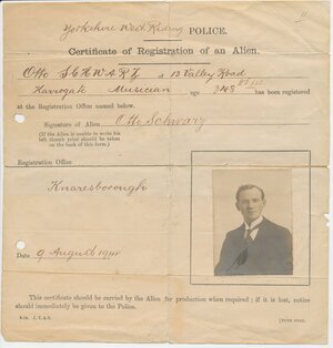 Musikerregistrierungg des Otto Schwarz, ausgestellt durch die Yorkshire West Riding Police am 09.08.1914, unmittelbar nach dem Ausbruch des 1. Weltkrieges und der britischen Kriegserklärung vom 04.08.1914