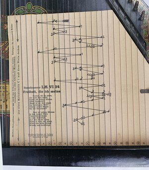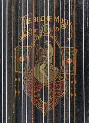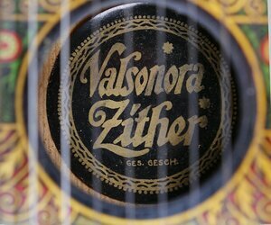 Akkordzither (Gitarrenzither, Gitarr-Zither) der Marke Valsonora. Eine Akkordzither ist eine aus Holz gefertigte griffbrettlose Zither. Sie wurde um 1880 als einfach spielbare Alternative zum fortlaufend professionalisierten Spiel auf der Konzertzither entwickelt. Unser Instrument ist schwarz und ist im Stil des Jugendstils polychrom mit zwei Pfauen einer Königskrone und Blumenranken geschmückt. Zum Spiel der Melodie besitzt sie auf der rechten Seite Seiten, die eine chromatische Tonleiter von c' bis c''' bilden. Links von dieser befinden sich zur Begleitung der Melodie 6 Akkorde zu je 4 Seiten. Jeder Akkord besitzt 3 Seiten deren Ton von links nach rechts tiefer wird und ganz rechts eine Bassseite, die meist einzeln gespielt wird. Große Akkordzithern besitzen 7 Seiten pro Akkord. Auf einem goldenen Band sind in schwarzer Schrift die Akkorde mit Ziffern (absteigende von 6 bis 1) bezeichnet. Dadurch kann eine einzelne Person gleichzeitig die Melodie und die Akkordbegleitung spielen. Auf dem goldenen Band sind die einzelnen Noten sind zusätzlich mit den in vielen Ländern üblichen Buchstaben (wobei für B/Ais und H/B beide sprachspezifischen Alternativen angegeben sind ), mit den italienischen Bezeichnungen und in Notenschrift bezeichnet. Bei den Seiten für die Melodie sind die Bezeichnungen ähnlich. Es fehlen die in Italien verwendeten Bezeichnungen, dafür steht ganz unten ein Nummerncode: diatonisch von 1 bis 15. Halbtöne verwenden den Code es darunterliegenden Ganztons und sind eingekreist. Tonhöhen der Akkordseiten (Akkorde und Seiten von links nach rechts): Akkorde von 6 bis 1: e'' h' gis' E e'' a cis' A d'' a' fis' D f'' c'' a F d'' hb' f G e' c g c Die Notation ist nicht in "normaler" Notenschrift, sondern in einer speziellen Tabulatur. Zum Spielen wird das Notenblatt unter die Melodiesaiten geschoben (siehe 2. Foto), der dickere Strich liegt unter der C-Saite, auf dem vorgezeichneten Weg ( Zickzacklinien ) werden die Melodietöne mit dem Daumen der rechten Hand gezupft, zudem wird ein Zitherring verwendet. Der Verlauf der Melodie ist von oben nach unten. Die Akkorde werden mit der linken Hand gespielt, mit dem bloßen Daumennagel oder auch mit einem Zitherring, was aber nicht so weich klingt. Lange Noten sind ein Kreis mit Loch, mittellange ein ausgefüllter Kreis und kurze ein kleiner Kreis. Die dazu passenden Akkorde sind links daneben mit dem entsprechenden Zahlencode notiert. Eine Zahl ohne Punkt bedeutet, dass die Bassseite des Akkords gespielt wird, ist ein Punkt daneben so wird der restliche Akkord gespielt. Das Zitherspiel war in dem Arbeitsgebiet unseres Museums vor allem zur Jahrhundertwende weit verbreitet. Ab dem 2. Weltkrieg ist es langsam ausgestorben. In Konz ist das letzte "Zitherorchester" in den 1960er Jahren nachweisbar. Akkordzithern werden noch in manchen Mittelgebirgsregionen und vor allem in der Schweiz gespielt.