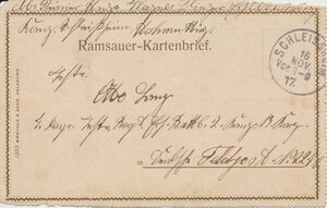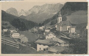 Postkarte an Otto Lang, Hinzweiler. Das Bild auf der Ansichtskarte zeigt den österreichischen Ort Ramsau südlich des Dachsteins. Die Berge im Hintergrund sind Teil der Hochköniggruppe, die ihrerseits wieder ein Teil der Berchtesgadener Alpen sind.