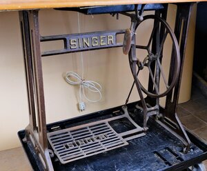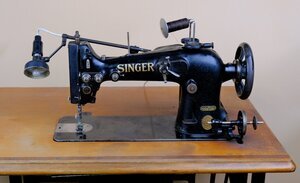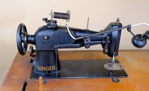 Die Klasse 207 D von Singer ist eine kombinierte Zickzack Maschine die speziell bei Herrenschneider Verwendung fand. Hergestellt wurde sie zwischen 1940 – 1945 im Singer Werk Wittenberge/Elbe unter der Fabriknummer C 3.377.528. Wie üblich in dieser Zeit ist auch unser Objekt schwarz lackiert und trägt auf beiden Seiten in großen, goldfarbenen Buchstaben den Namen „Singer“. Die Maschine ist auf einer furnierten Arbeitsplatte montiert, die auf einem Gusseisernen Untergestell befestigt ist. Der Antrieb erfolgt wahlweise elektrisch, oder, wie bei unserem Modell, mechanisch. Der erforderliche Lederriemen treibt nicht nur die Maschine an, sondern auch den Aufspuler. Für eine optimale Beleuchtung sorgt die angebaute, flexibel schwenkbare Singer Nähleuchte Auf der Unterseite der Arbeitsplatte ist ein Kniehebel angebaut, der durch Druck die Presserstange anhebt, so dass die rechte Hand frei bleiben kann. Daneben ist eine Schublade integriert, in der sich heute noch Ersatzteile, Zubehör, eine große robuste Schneiderschere sowie Werkzeug befindet. An der Vorderseite der 207 fallen gleich drei Spannungsscheiben auf, die einen schnellen Wechsel zwischen Näh-, Knopfloch-, und der Spannung zum Sticheschlagen ermöglichen. Die Maschine beherrscht das Vorwärts-, Rückwärts- und Zickzacknähnen. Mit entsprechendem Zubehör lassen sich alle Arbeiten einfach und schnell ausführen, die beim Herrenschneider anfallen. Eine Original Gebrauchsanweisung für unsere Singer 207 D ist ebenfalls erhalten geblieben. (Siehe Link)