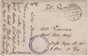 Die schwarzweiß Bildkarte zeigt einen Mannschaftsdienstgrad in Husarenuniform. Abgeschickt wurde die Bildkarte als Ansichtskarte/Feldportkarte in Antwerpen von Matthias Ginsler (aus Bodendorf/Ahr), der beim Husarenregiment 9, 4. Eskadron [kleinste taktische Einheit der Kavallerie] diente und ist an seinen Freund Musikant in der Maschinengewehr Kompanie des Infanterieregimentes Nr. 161 geschickt. Die Familie Ginzler hatte in Bodendorf/Ahr einen Kolonialwarenladen, den sie bis nach dem 2. Weltkrieg betrieben.