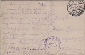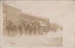 Die Sepia-Ansichtskarte zeigt ein von vier Pferden gezogener voll beladener Leiterwagen mit drei Soldaten, einer auf dem vorderen Pferd, einer steht auf dem Kutschbock und einer in weißer Arbeitskleidung auf der Ladefläche. Drei Soldaten stehen am rechten Bildrand und dahinter ist eine wegfahrende Kutsche zu sehen. Auf der Häuserwand steht über den Eingang "Waffensammelstelle des XIII Armeekorps".Im Eingang steht eine weiterer Soldat in weißer Arbeitskleidung.