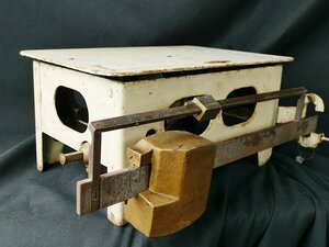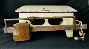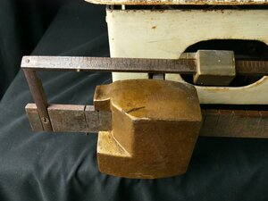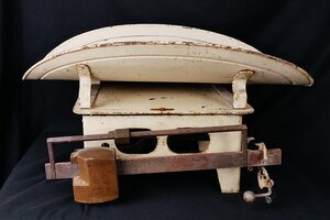 Laufgewichtswaage zum Wiegen von Säuglingen. Die stabile Waage ist bis 21 kg belastbar. Die Waage ist größtenteils weiß lackiert und steht auf 4 Füßchen. Die Waage besteht aus zwei Teilen: Der Unterteil ist eine Laufgewichtswaage. Auf dieser steht unverbunden ein Aufsatz in den ein Baby gelegt werden kann. An der Vorderseite ist auf dem Deckel des Unterteils der Waage ist das Logo des Herstellers angebracht. Leider ist es nicht mehr lesbar. Laufgewichtswaagen sind asymmetrische Balkenwaagen. Dieses seit der römischen Schnellwaage bekannte Prinzip wurde in den Laufgewichts-Brückenwaagen weiterentwickelt. Mittels Verschieben der Gewichte auf der mit einer Messskala ausgestatteten Brücke kann das Gewicht des Wiegeguts ermittelt werden. Die Waage ist dann im Gleichgewicht, wenn der rechts an der Brücke angebrachte Marker auf gleicher Höhe wie der an der Waage fest angebrachte Marker ist. Die Gewichtsmessung erfolgt folgendermaßen: Die Schale wird mit dem Wiegegut gefüllt und drückt auf die unterhalb innerhalb des Gehäuses der Waage befindlichen Mechanik. Die Brücke klappt links nach unten und rechts nach oben. Das untere (große) Gewicht auf der unteren Schiene dient der "Grobeinstellung" und läuft von 0 kg bis 20 kg. Im Verlauf des Wiegens wird dieses so weit nach rechts verschoben, dass die Leiste mit der Skala gerade nicht nach rechts kippt. Das Gewicht lässt man nun bei der Aussparung der letzten davorliegenden Groß-Maßeinheit einrasten. Auf einer Schiene darüber befindet sich ein kleineres Gewichte. Es dient beim Wiegevorgang zur bis auf 10 g genauen Feineinstellung und läuft von 0 g bis 1000 g.
