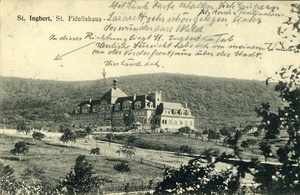 Schwarzweiß digitale Kopie einer Ansichtskarte mit Gruppenfoto von Verwundete des Lazarett Remagen (im Rheinhotel). In der Bildmitte eine Krankenschwester, die zwei vor ihr stehenden Kindern die Hände auf die Schultern gelegt hat. Hinter der Gruppe ist ein Schild an der Wand angebracht, auf dem "Persion" steht.