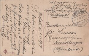 Patriotische Postkarte mit Deutschland-Flagge (Kaiserreich), Tannengrün mit Weihnachtsdekor. Verschickt wurde die Karte von Pionier Heinr. Stesetkes aus Grefrath an den Krankenwärter Josef Simons, der zu der Zeit sich im Genesungsheim in Denklingen aufhielt.