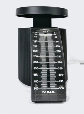 Oberschalige schwarze Feder-Briefwaage für einen Wiegebereich von 0 bis 500 g . Runde Waage an deren Frontseite die Skala hervorsteht. Weiße Schrift auf schwarzem Hintergrund. Die Waage war im Frühjahr 2024 bei diversen Internetplattformen als Auslaufmodell verfügbar und kam im Rahmen einer Haushaltsauflösung ins Museum.