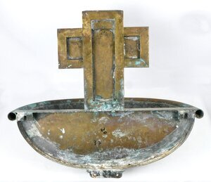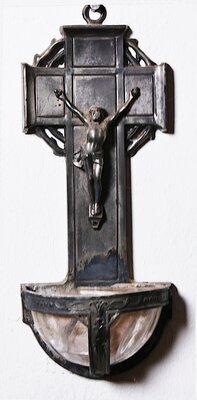 Weihwasserbecken aus der 1907 geweihten und 2017 profanierten Kirche St. Paulus in Trier. Das Weihwasserbecken besitzt als Schmuckelement über dem eigentlich Becken ein Kreuz.