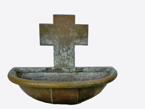 Weihwasserbecken aus der 1907 geweihten und 2017 profanierten Kirche St. Paulus in Trier. Das Weihwasserbecken besitzt als Schmuckelement über dem eigentlich Becken ein Kreuz.