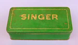 Eine Original Singer Werkzeugbox die ursprünglich einer Nähmaschne Modell 15 bei gepackt war. Die Box ist aus Blech gefertigt und hat eine grüne Grundlackierung. Der aufklappbare Deckel trägt auf der Außenseite den Firmennamen "Singer" der goldfarben eingerahmt ist. Auf beiden Stirnseiten ist die Modellnummer 15 aufgedruckt. Die Box beinhaltet noch Zubehörteile, eine Ersatzspule sowie Nähutensilien.