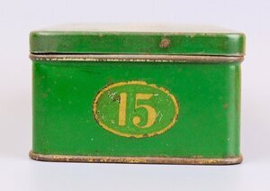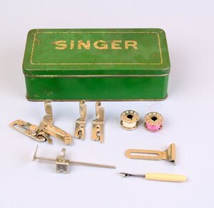 Eine Original Singer Werkzeugbox die ursprünglich einer Nähmaschne Modell 15 bei gepackt war. Die Box ist aus Blech gefertigt und hat eine grüne Grundlackierung. Der aufklappbare Deckel trägt auf der Außenseite den Firmennamen "Singer" der goldfarben eingerahmt ist. Auf beiden Stirnseiten ist die Modellnummer 15 aufgedruckt. Die Box beinhaltet noch Zubehörteile, eine Ersatzspule sowie Nähutensilien.