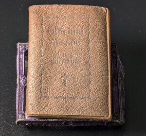 Eine neutrale Nähmaschinen Werkzeugbox mit Inhalt. Die Bleckschachtel ist rundum hellbraun lackiert. Der Deckel zusätzlich mit einem weißen Ornamentmuster eingerahmt. Der Inhalt besteht aus Ersatz- und Zubehörteilen, sowie einem gezahnten Kopierrad, Schraubenzieher, einer Schneiderkreide und Reservenähnadeln.