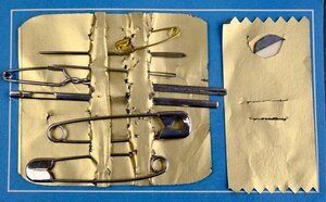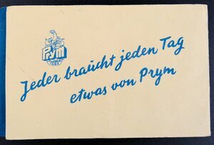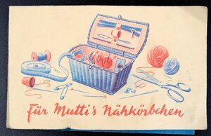 Ein aufklappbares Heftchen (ca. 12 x 8 cm) der Firma Prym. Auf der Vorderseite ist eine vielzahl von verschiedenen Nähzubehör abgebildet, darunter steht der Schriftzug " Für Muttis Nähkörbchen." Die Innenseiten sind gefüllt mit Verbrauchsmaterial. Auf der einen Seite finden sich Nähnadeln verschiedener Stärken, auf der Anderen Sicherheitsnadeln, Durchzugshilfen zum einfädeln von Gummis und Platz für einen eifachen Einfädler. (der fehlt). Auf der Rückseite findet sich das Prym Logo verbunden mit einer Werbung in eigener Sache "Jeder braucht jeden Tag etwas von Prym"