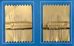 Ein aufklappbares Heftchen (ca. 12 x 8 cm) der Firma Prym. Auf der Vorderseite ist eine vielzahl von verschiedenen Nähzubehör abgebildet, darunter steht der Schriftzug " Für Muttis Nähkörbchen." Die Innenseiten sind gefüllt mit Verbrauchsmaterial. Auf der einen Seite finden sich Nähnadeln verschiedener Stärken, auf der Anderen Sicherheitsnadeln, Durchzugshilfen zum einfädeln von Gummis und Platz für einen eifachen Einfädler. (der fehlt). Auf der Rückseite findet sich das Prym Logo verbunden mit einer Werbung in eigener Sache "Jeder braucht jeden Tag etwas von Prym"