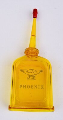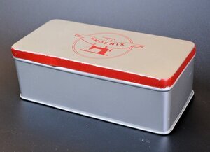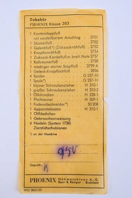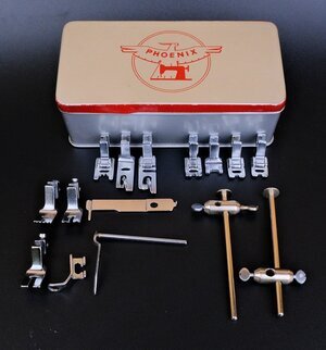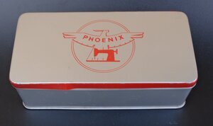 Eine reichlich gefüllte Werkzeugbox, hergestellt aus Blech. Der Behälter ist silbern lackiert und trägt auf der Deckeloberseite das Logo und den Schriftzug von Phönix. Vermutlich gehörte die Box zur Nähmaschine Phönix Klasse 283, die etwa 1957 gebaut wurde. Der Inhalt ist besonders gut erhalten, da alle Ersatz- und Zubehörteile in Ölpapier eingewickelt sind. Außer dem reichhaltigen Zubehör, befindet sich noch ein leeres, ölgetränktes Tütchen mit der Aufschrift "Phönix Ersatzteile und Zubehör" in der Box. Außerdem ist noch eine Liste des damals mitgelieferten Zubehörs, eine Ölkännchens und einem Saum-Trenner vorhanden.