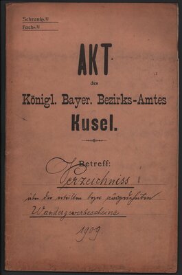 Jahresregister aller vom Bezirksamt Kusel ausgestellten Wandergewerbescheine von 1909