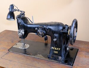 Unser Objekt wurde bei Pfaff in Kaiserslautern unter der Herstellungsnummer 3737071 im Jahre 1942 als Flachbettnähmaschine hergestellt. Das Modell 130 wurde über 20 Jahre lang gebaut. Die Maschine galt als robust, langlebig mit einer leichtgängigen Mechanik. Das Geheimnis ihrer sehr ruhigen Laufeigenschaften, lag auch an der neu verbauten Schnurkette als Antrieb. Die Maschine kann mechanisch mittel Tretpedal oder mit einem Elektromotor betrieben werden. Er stammt von der Firma ELTE, Typ PE 30 mit 5.500 U/min. Die Pfaff 130 ist eine klassische Haushaltsnähmaschine, die den ZickZack Stich genauso beherrscht wie das Vor- und Rückwärtsnähen. Die Maschine ist schwarz lackiert und trägt der Vorderseite die Typenbezeichnung "Pfaff 130" Auffällig am Maschinenarm ist ein relativ großer Drehschalter, mit dem sich die ZickZack Varianten, einschließlich der benötigten Stichlängen einstellen lassen. Nachträglich wurde eine Nähleuchte angebracht. Allerdings nicht von Pfaff, sondern von deren Wettbewerber, der Firma Singer. Aber sie passt. Unsere Maschine hat einen Holzunterbau und ist versenkbar. Leider ist die Abdeckplatte nicht mehr vorhanden. Unterhalb der Tischplatte sind 2 seitliche Schubladen sowie eine Kippfach in der Mitte eingebaut. Sie dienen der Aufnahme von Nähutensilien.