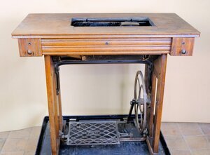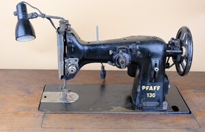 Unser Objekt wurde bei Pfaff in Kaiserslautern unter der Herstellungsnummer 3737071 im Jahre 1942 als Flachbettnähmaschine hergestellt. Das Modell 130 wurde über 20 Jahre lang gebaut. Die Maschine galt als robust, langlebig mit einer leichtgängigen Mechanik. Das Geheimnis ihrer sehr ruhigen Laufeigenschaften, lag auch an der neu verbauten Schnurkette als Antrieb. Die Maschine kann mechanisch mittel Tretpedal oder mit einem Elektromotor betrieben werden. Er stammt von der Firma ELTE, Typ PE 30 mit 5.500 U/min. Die Pfaff 130 ist eine klassische Haushaltsnähmaschine, die den ZickZack Stich genauso beherrscht wie das Vor- und Rückwärtsnähen. Die Maschine ist schwarz lackiert und trägt der Vorderseite die Typenbezeichnung "Pfaff 130" Auffällig am Maschinenarm ist ein relativ großer Drehschalter, mit dem sich die ZickZack Varianten, einschließlich der benötigten Stichlängen einstellen lassen. Nachträglich wurde eine Nähleuchte angebracht. Allerdings nicht von Pfaff, sondern von deren Wettbewerber, der Firma Singer. Aber sie passt. Unsere Maschine hat einen Holzunterbau und ist versenkbar. Leider ist die Abdeckplatte nicht mehr vorhanden. Unterhalb der Tischplatte sind 2 seitliche Schubladen sowie eine Kippfach in der Mitte eingebaut. Sie dienen der Aufnahme von Nähutensilien.