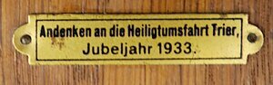 Hölzernes mittelbraun gebeiztes Wandkreuz. Die Enden des Kreuzes sind typisch neugotisch mit 3 Passen versehen. Der Korpus ist aus Porzellan. Die Arme sind schräg nach oben ausgestreckt. Der Rechte Arm hat eine Bruchstelle. Der Korpus ist aus weißem Biskuit-Porzellan gefertigt. Die Füße stehen übereinander auf einer Konsole. Die Füße sind auf dieser angeklebt und die Konsole ist am vertikalen Balken angeklebt. Über dem Korpus hängt der zweizeilige Titulus crucis (die INRI-Tafel). Unten am Längsbalken ist die Plakette "Andenken an die Heiligtumsfahrt Trier, Jubeljahr 1933" befestigt. Der Begriff "Jubeljahr" bezieht sich auf die Ausstellung des Heiligen Rocks in Trier, nicht auf die politischen Ereignisse in diesem Jahr.