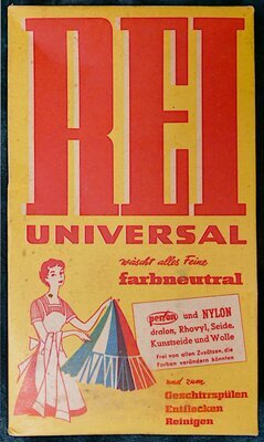 Eine Packung REI universal - wäscht alles feine farbneutral. Das Waschmittel wurde für nahezu alle Anwendungszwecke verkauft. Auf der Packung werden 12 Anwendungszwecke (Feinwäsche, Autowäsche, Geschirrabwasch, etc.) angepriesen und für jeden wird die passende Anwendung und Dosierung beschrieben. Dies erfolgt durch einen Text und ein Bild auf der Rückseite und beiden schmalen Seiten auf der Packung.