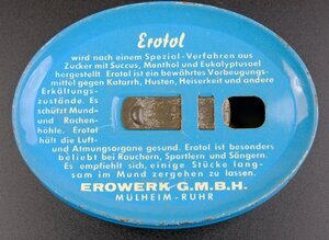 Ovale Blechdose für den Verkauf von Hustenpastillen der Firma EROWERK GmbH, Mülheim/Ruhr. (1950 -1970) Der Deckel ist blau/hell-beige gestaltet und trägt außer der Werbung das Firmenlogo, ein Zuckerhut. Auf der Rückseite findet sich eine sehr detaillierte Produktinformation, gepaart mit Werbung. Ebenfalls auf der Rück/Unterseite befindet sich eine Schiebeöffnung, durch die bei Bedarf, eine einzelne Pastille entnommen werden konnte. Unsere Dose ist heute leer.